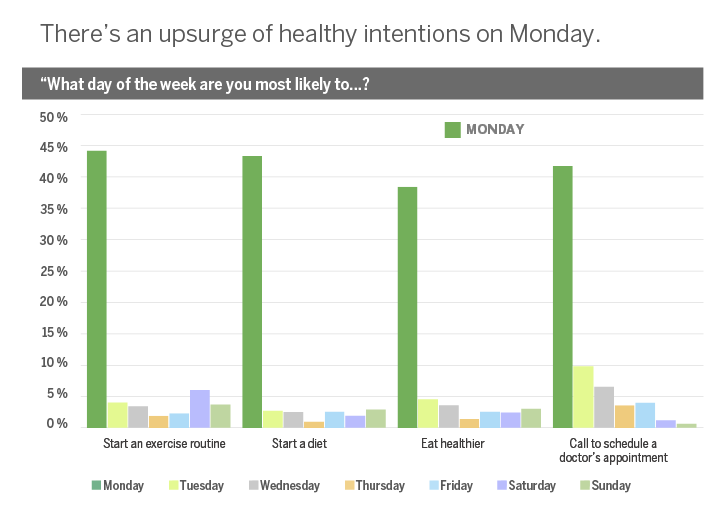People are more likely to either start diets, exercise regimens, quit smoking or schedule doctor’s appointments on Monday than on other days of the week.3, 4